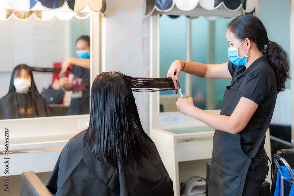 Asian young woman wearing face masks to protect themselves from Covid-19 during hairdresser trimming black hair with scissors in beauty salon.