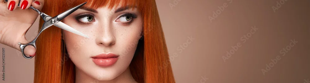 Beautiful young woman with a bright makeup and a smooth long hair holds metal scissors. Model with red hair. Hair salon, haircut. Care and beauty hair products. Perfect make-up