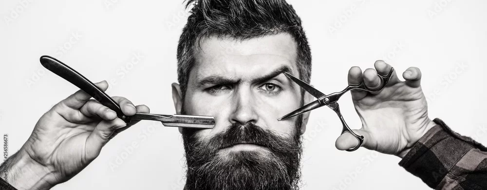 Fototapeta samoprzylepna Brodaty mężczyzna, brodaty mężczyzna. Portret brody stylowy mężczyzna. Nożyce fryzjerskie i brzytwa prosta, fryzjer. Vintage fryzjer, golenie.