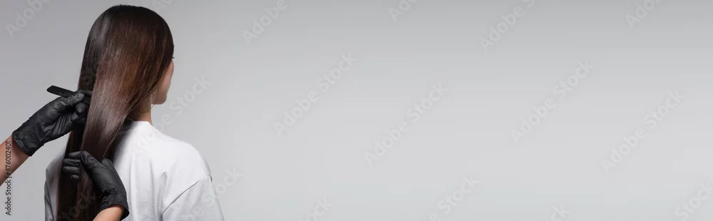 Fototapeta samoprzylepna colorist in latex gloves holding comb near long hair of client isolated on grey, banner