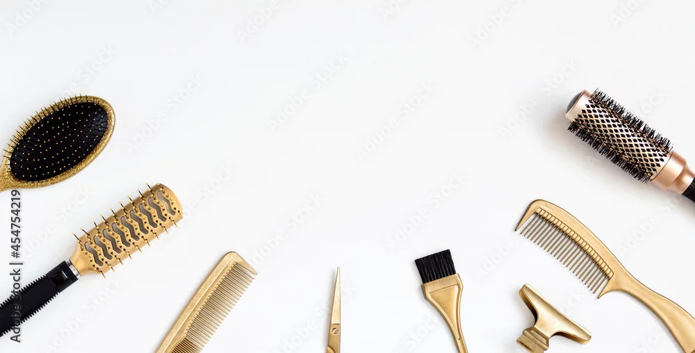 Golden hairdresser tools on a white background, scissors, comb, clip, brush. Hair salon accessories, template with space for text.