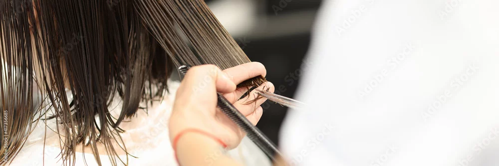 Fototapeta samoprzylepna Hairdresser holds client's wet hair and cuts it. Training profession hairdresser concept