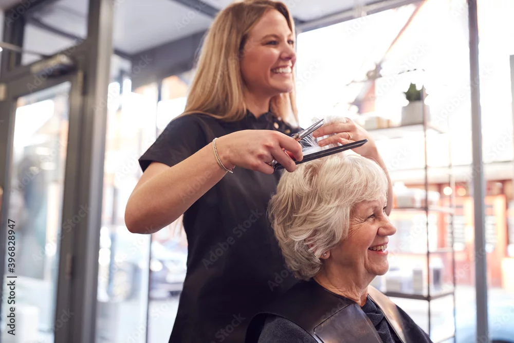 Fototapeta samoprzylepna Senior Woman Having Hair Cut By Female Stylist In Hairdressing Salon - do fryzjera - Picturewall.pl