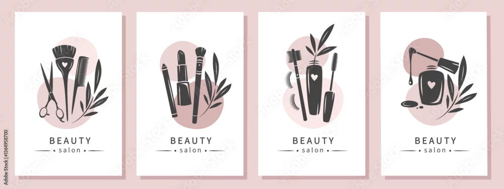 Fototapeta samoprzylepna Set of elements and icons for beauty salon. Nail polish, makeup tools, cosmetic brushes, lipstick, eyelash extension, hairdresser tools. Vector illustrations for banner, cover, marketing.