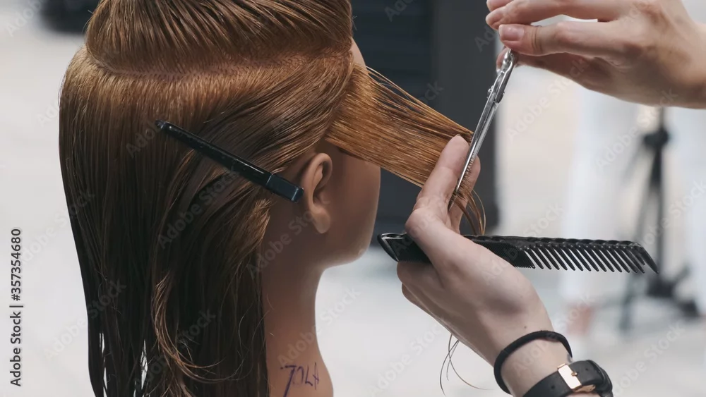 Fototapeta samoprzylepna Stylist hair cutting with scissors on mannequin head, practices and training