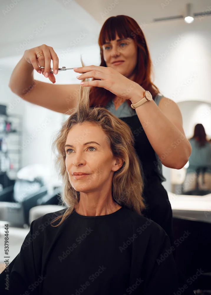 Woman, hair and salon for haircut with hairdresser for beauty, style or makeover. Customer, beautician and cosmetics for professional hair care, service or fashion in studio, spa or shop in Toronto