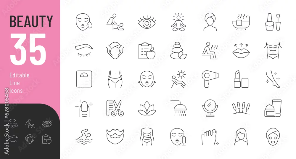 Fototapeta samoprzylepna Beauty Line Editable Icons set. Vector illustration in thin line modern style of body care related icons: cosmetic procedures for face and body, diet, cosmetics, and more.