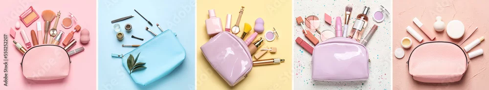 Fototapeta samoprzylepna Collage of bags with makeup cosmetics on color background