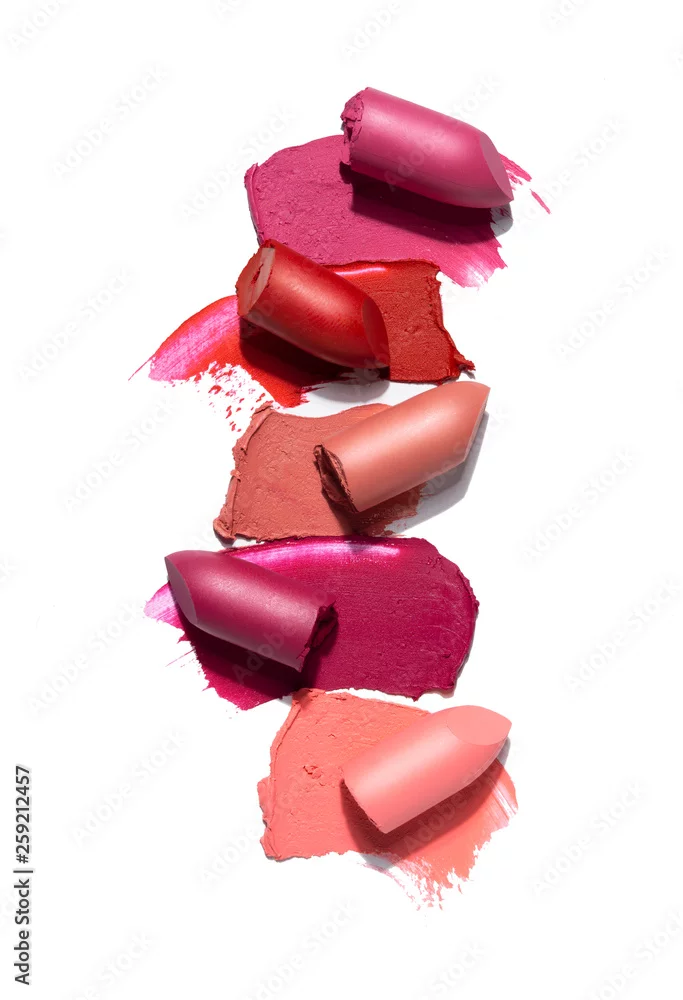 Fototapeta samoprzylepna Creative concept photo of cosmetics swatches beauty products lipstick on white background.