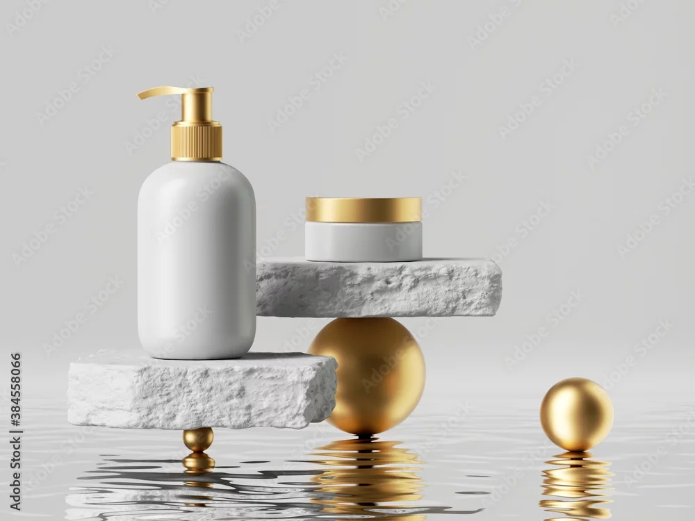 3d render, abstract modern cosmetics presentation. White cream jar and dispenser bottle with golden caps placed on cobblestone platforms on golden balls. Blank package mockup, commercial showcase