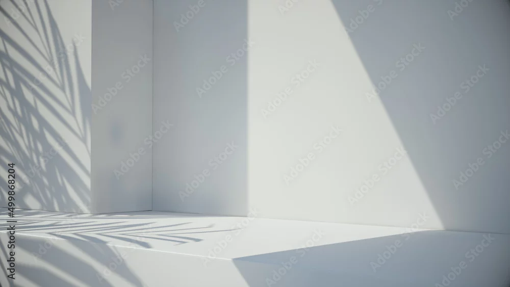 3d rendering stage background product display podium scene with leaf platform. Grey stand to show cosmetic product. 3d Stage showcase on display white background with leaf palm shadow.