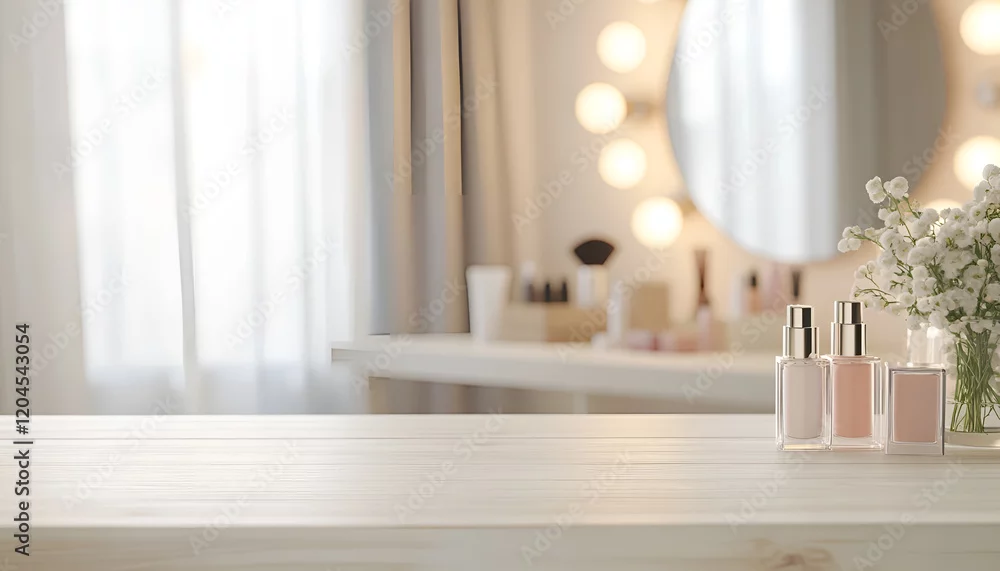 Fototapeta samoprzylepna Defocused makeup mirror in dressing room with wooden table top