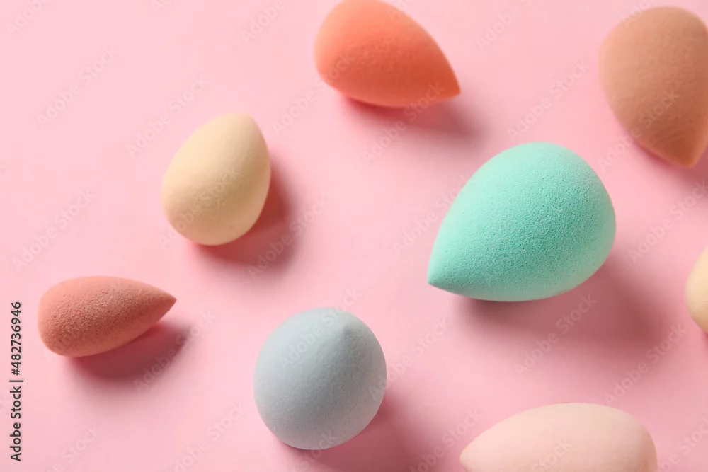 Fototapeta samoprzylepna Different makeup sponges on pink background, closeup