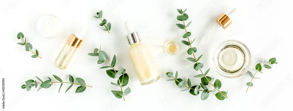 Fototapeta samoprzylepna Eucalyptus essential oil, eucalyptus leaves on white background. Natural, Organic cosmetics products. Medicinal plant. Natural Serums. Flat lay, top view.