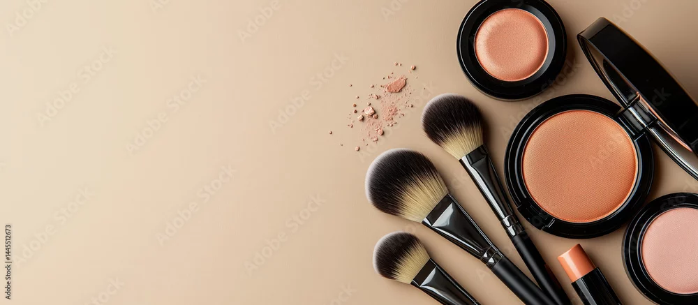 Flat lay of professional makeup products and brushes on a beige background, representing beauty, cosmetics, and skincare branding with elegant simplicity