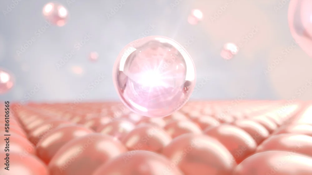 Fototapeta samoprzylepna Glow pink bubbles drop to cell skin.Beauty cosmetic protect and anti aging with laboratory and science conceptual.