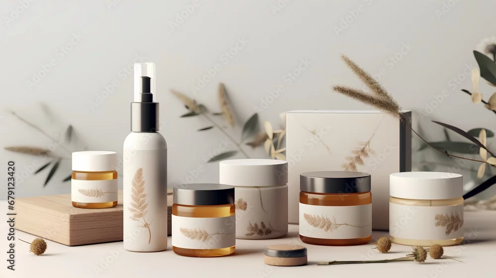 Fototapeta samoprzylepna Highresolution product packaging mockups for a natural cosmetics line, featuring ecofriendly materials and minimalist design, perfect for branding presentations.