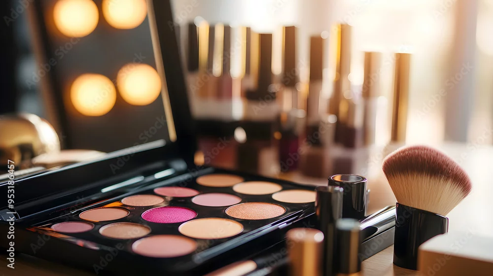 Makeup palette with a variety of colorful eyeshadows and a makeup brush, surrounded by beauty products on a dressing table, illuminated by soft, warm lighting