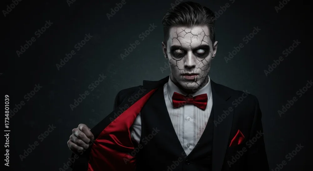 Fototapeta samoprzylepna Man in suit with zombie makeup posing dramatically for Halloween - do gabinetu kosmetycznego - Picturewall.pl