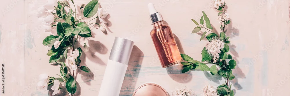 Fototapeta samoprzylepna Natural organic cosmetics: serum, cream, mask on wooden background with flowers. Spa concept - do gabinetu kosmetycznego - Picturewall.pl