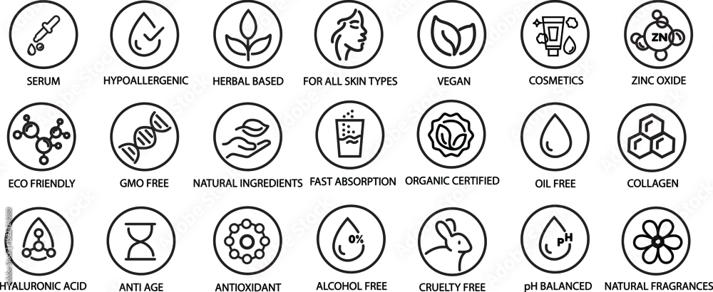 Fototapeta samoprzylepna Organic, natural, vegan, cruelty free, collagen, anti age, antioxidant cosmetic editable stroke outline icons set isolated on white background flat vector illustration. Pixel perfect. 64 x 64.