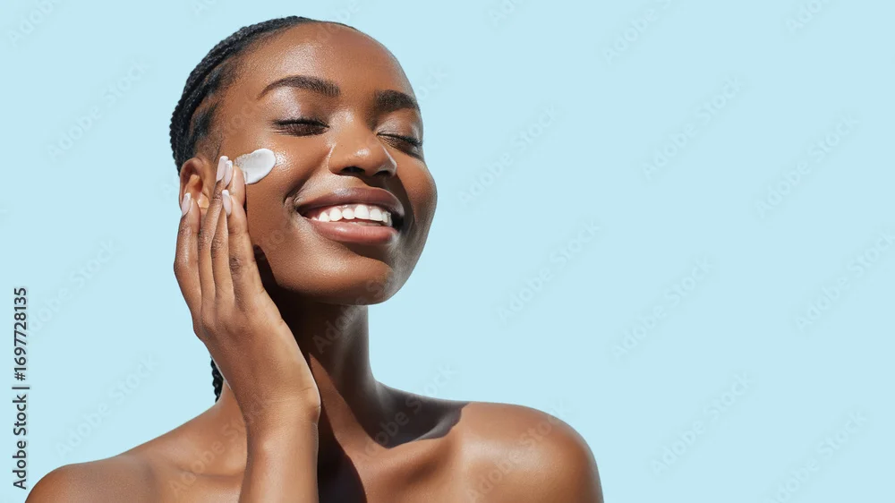 Overjoyed African American young woman with afro braids hairstyle is applying cosmetic product on her face Skin care beauty portrait. Cream smear. Hydration, nourishing and moisturising.