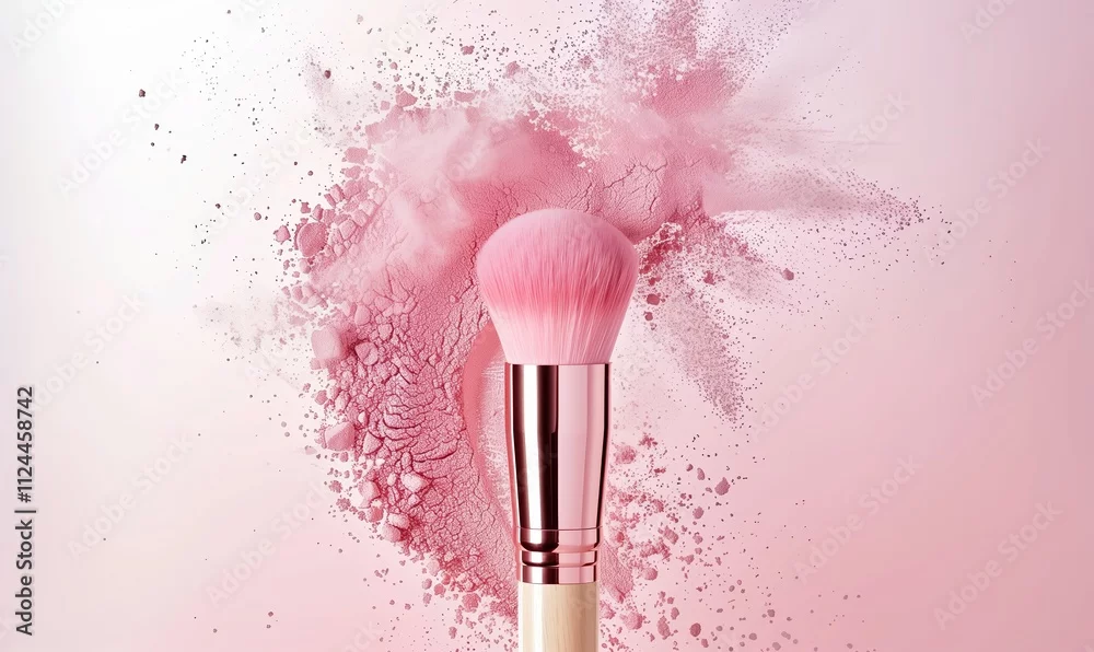 Fototapeta samoprzylepna Pink makeup brush with powder explosion on pink background. Beauty product concept