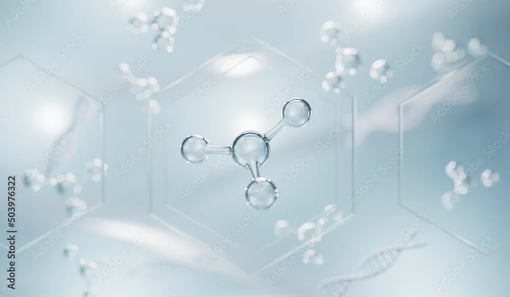 Realistic molecules background. Science illustration of a cream molecule. Hyaluronic acid skin solutions advertising, collagen serum drop with cosmetic advertising background. 3d rendering.