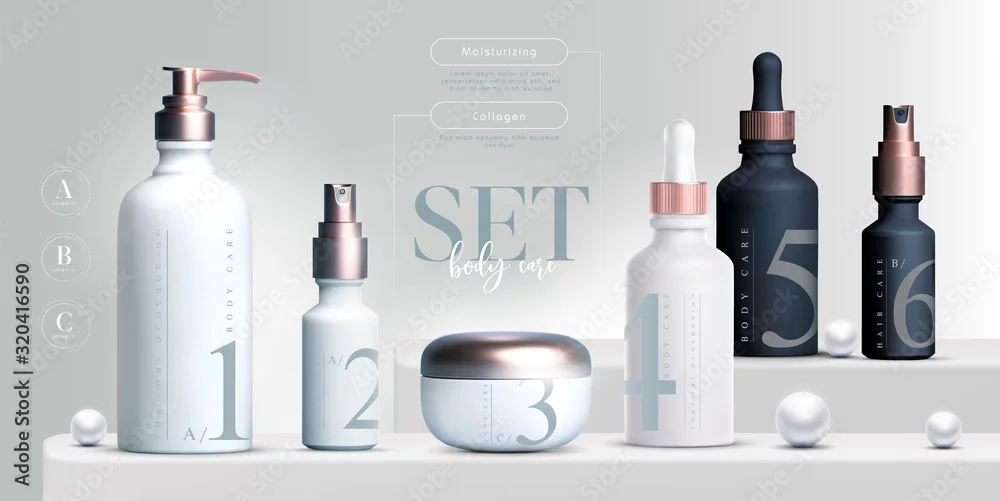 Vector 3D elegant cosmetic products set background premium cream jar for skin care products. Luxury facial cream. Cosmetic ads flyer or banner design. Cosmetic cream template. Makeup products brand.