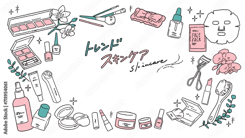 手書き風のおしゃれなアイシャドウやリップ、フェイスマスクやネイルなどのスキンケア・メイクアップツールのベクターイラストフレーム素材 Vector illustration frame of a stylish skin care and makeup tool in hand-drawn style.