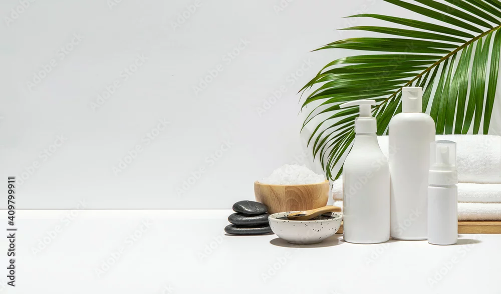 White cosmetic bottles with spa element and towel with palm leaf on white background. Blank label for branding mock-up. Natural beauty product concept. Copy space.