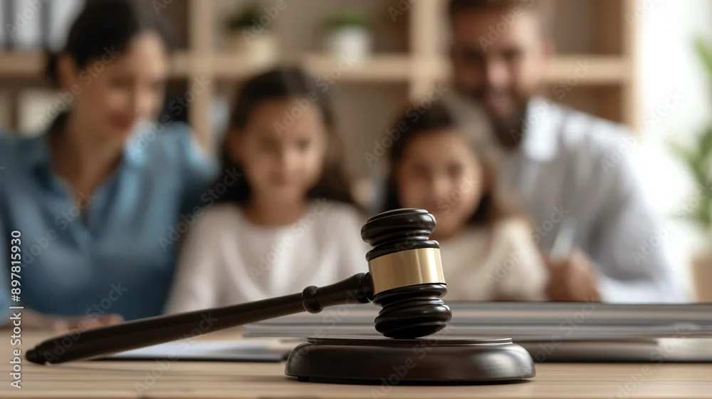 Fototapeta samoprzylepna A gavel symbolizes justice as a family engages in important discussions, highlighting the importance of law and family values.