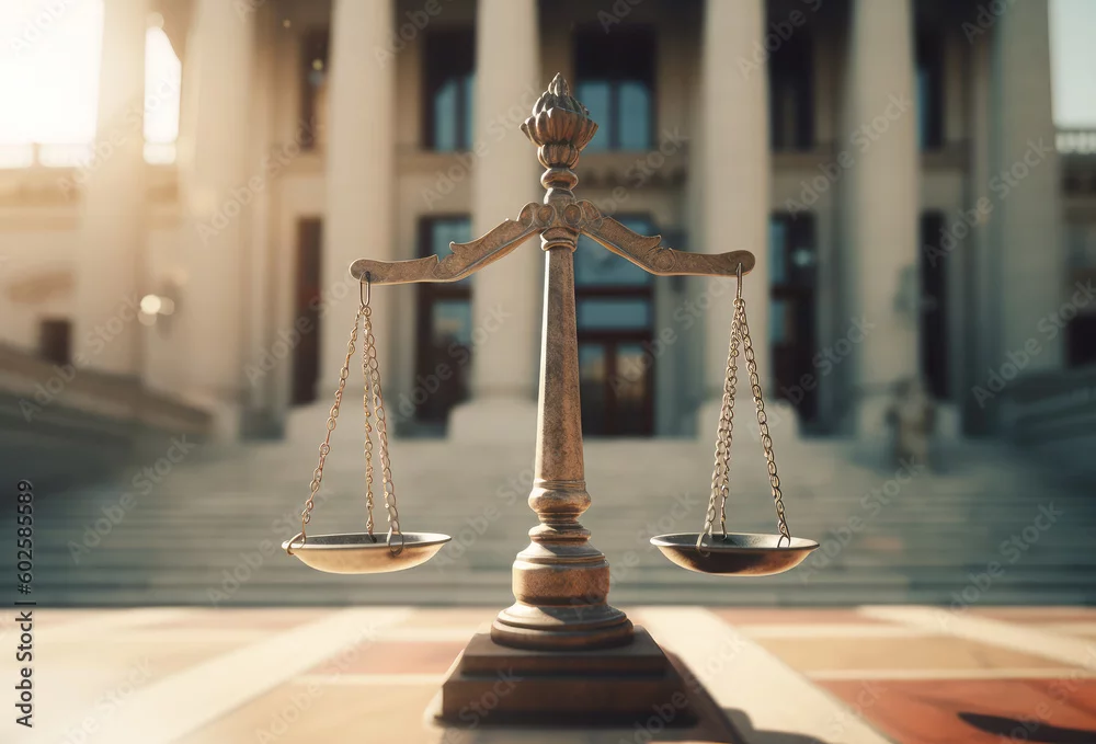 fairness scales of justice against court house building background banner, concept of business financial protection by law. generative ai