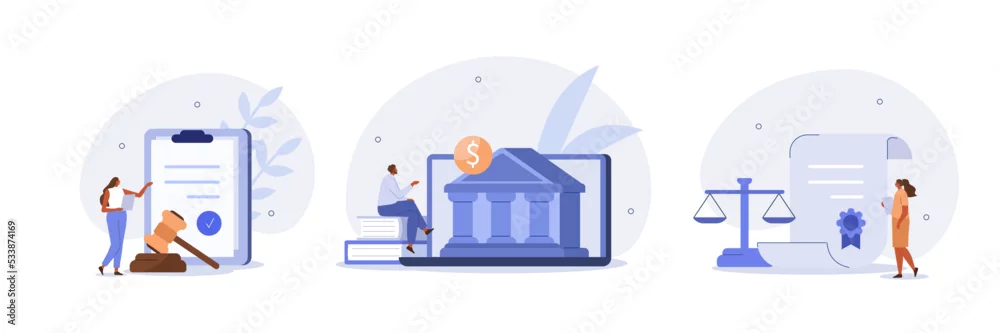 Law and justice illustration set. Characters and lawyers signing contract, agreement or document. Public law consulting and legal advice concept. Vector illustration.