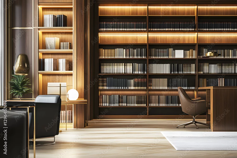 Law library with shelves of books and legal documents in a professional office. Law room office Library for study and learning. Interior photography detail of books on shelf in law firm.