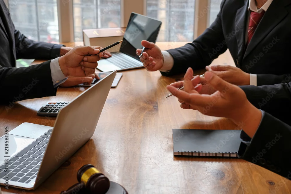 lawyer give advice to business people. businessman discussing legal legislation at law firm. judge gavel & team meeting at courtroom