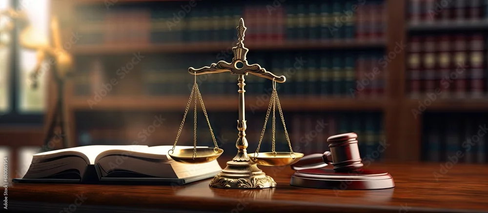 Fototapeta samoprzylepna Legal concept illustration of Justice Scales and law books on a desk Copy space image Place for adding text or design