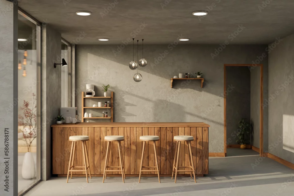 Fototapeta samoprzylepna Beautiful modern loft kitchen or snacks bar interior design with wooden counter bar