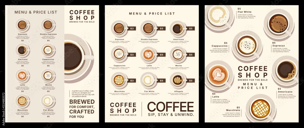 Fototapeta samoprzylepna coffee shop and cafe menu mockup template design, vector illustration of coffee flat style, food and drink concept, poster and promotion, coffee cup of espresso, americano, mocha, latte and flat white