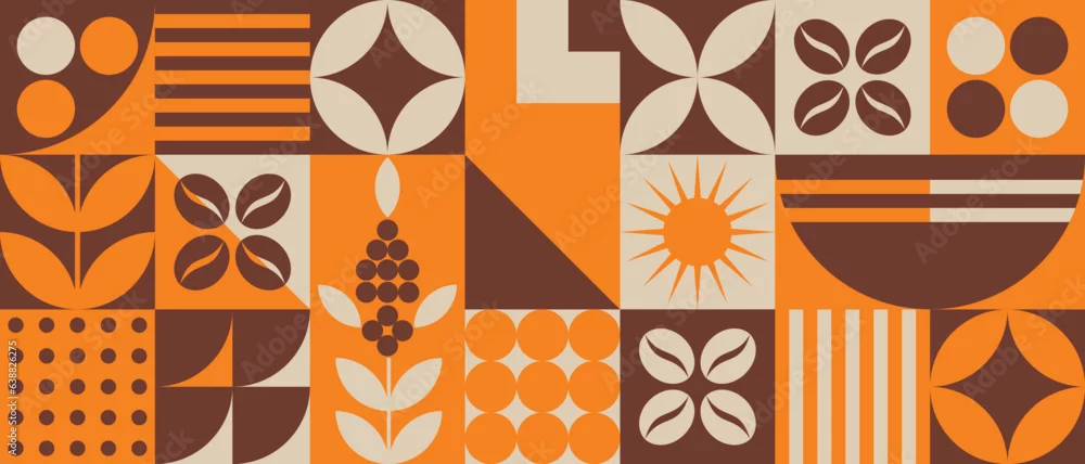 Fototapeta samoprzylepna Pattern with coffee theme in geometric minimalistic style. Print with abstract shapes. Illustration for cover design, food package, menu, background, café wall, coffee shop, banners.