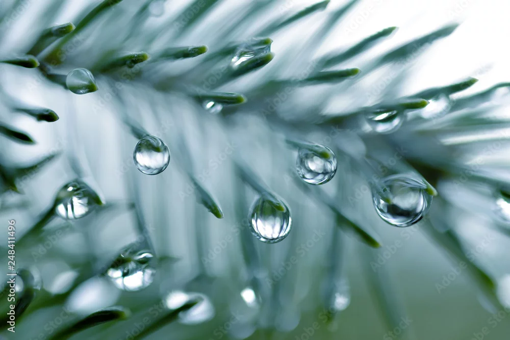 Fototapeta samoprzylepna Krople deszczu na igłach świerkowej gałęzi; natura z bliska