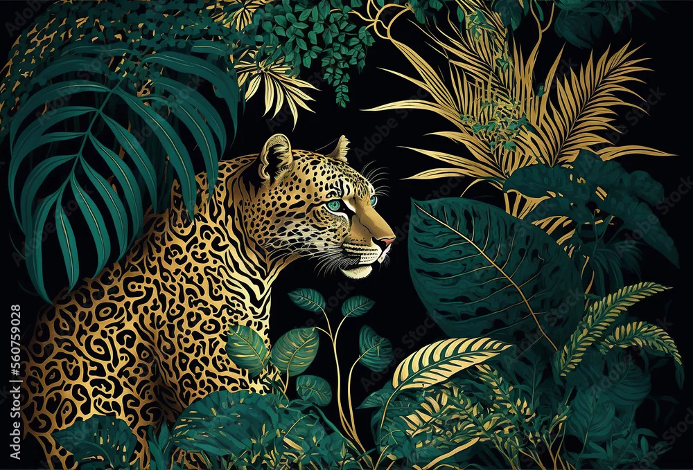 Fototapeta samoprzylepna Tropical art nouveu, art deco print design with leaves and leopard. Generative ai