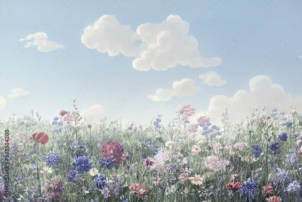 Fototapeta samoprzylepna Children's painted colored wallpaper. Colorful illustration of a wide blooming summer meadow. Design for a children's room, wallpaper, photo wallpaper.