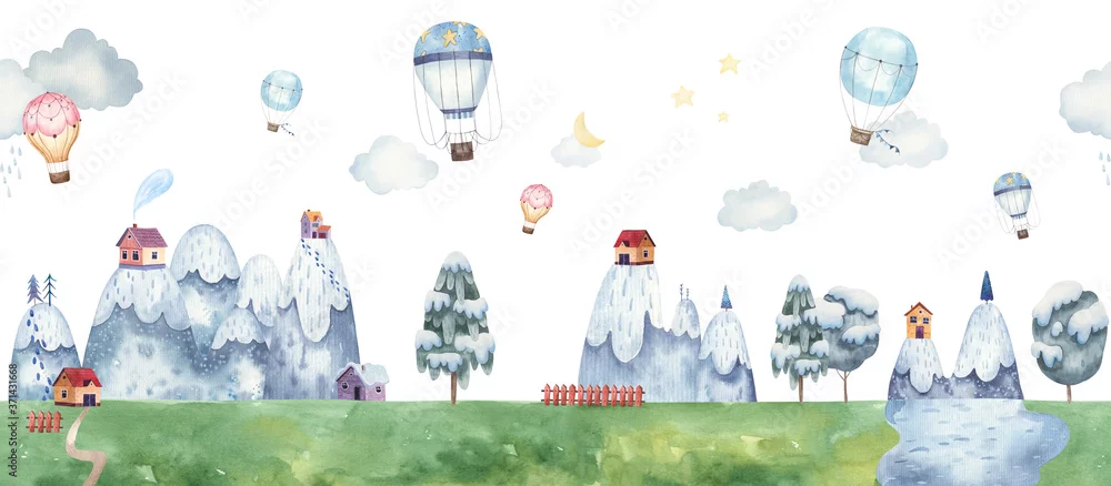 Fototapeta samoprzylepna góry, domki i balony z chmurami