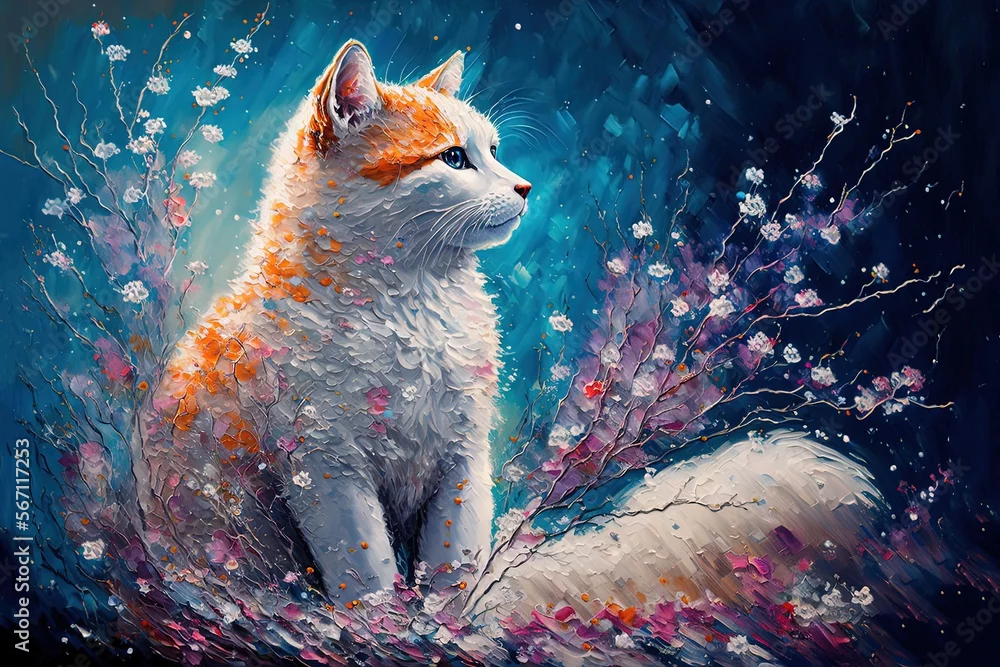 illustration of cute animal smile face in spring flower gardens, idea for children room wall decor or animal wallpaper, little kitten cat, generative Ai