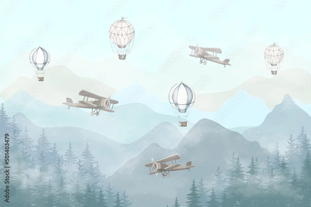 Fototapeta samoprzylepna Illustration of flying planes and balloons with a blue background. Slightly misty forest and high mountains. Kids wallpaper style.