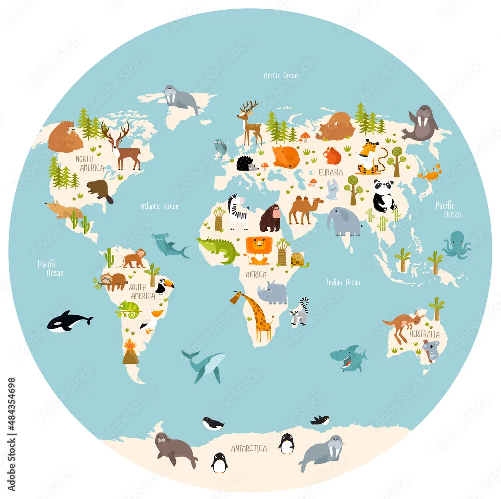 Fototapeta samoprzylepna Mapa świata ze zwierzętami z kreskówek dla dzieci. Eurazja, Ameryka Południowa, Ameryka Północna, Australia i Afryka.