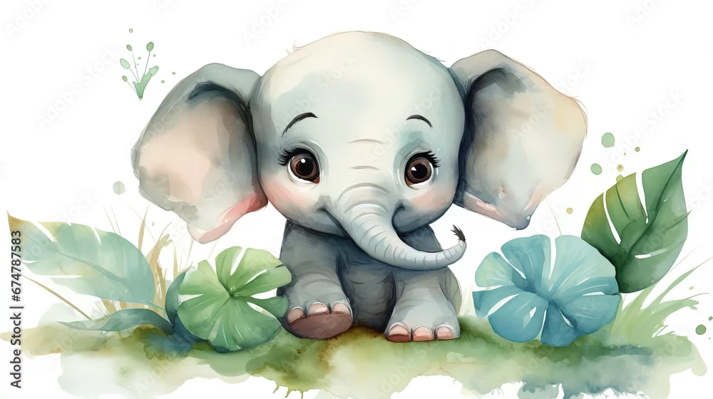watercolor style illustration of happy baby elephant in green tropical garden, idea for home wall decor, kid room, Generative Ai