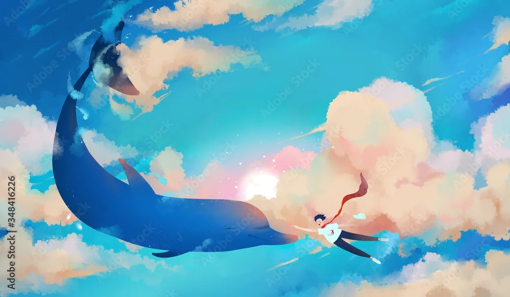 Fototapeta samoprzylepna Delfin i chłopiec bawią się w powietrzu.