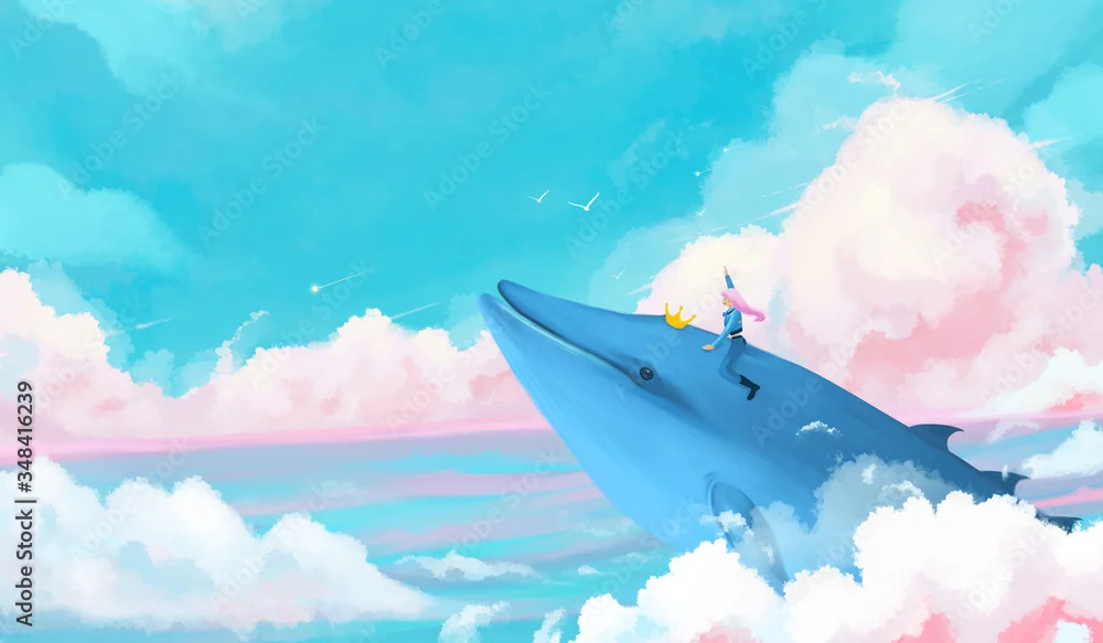 Fototapeta samoprzylepna Dziewczyna na wielorybie unoszącym się w powietrzu. Piękna kreatywna ilustracja